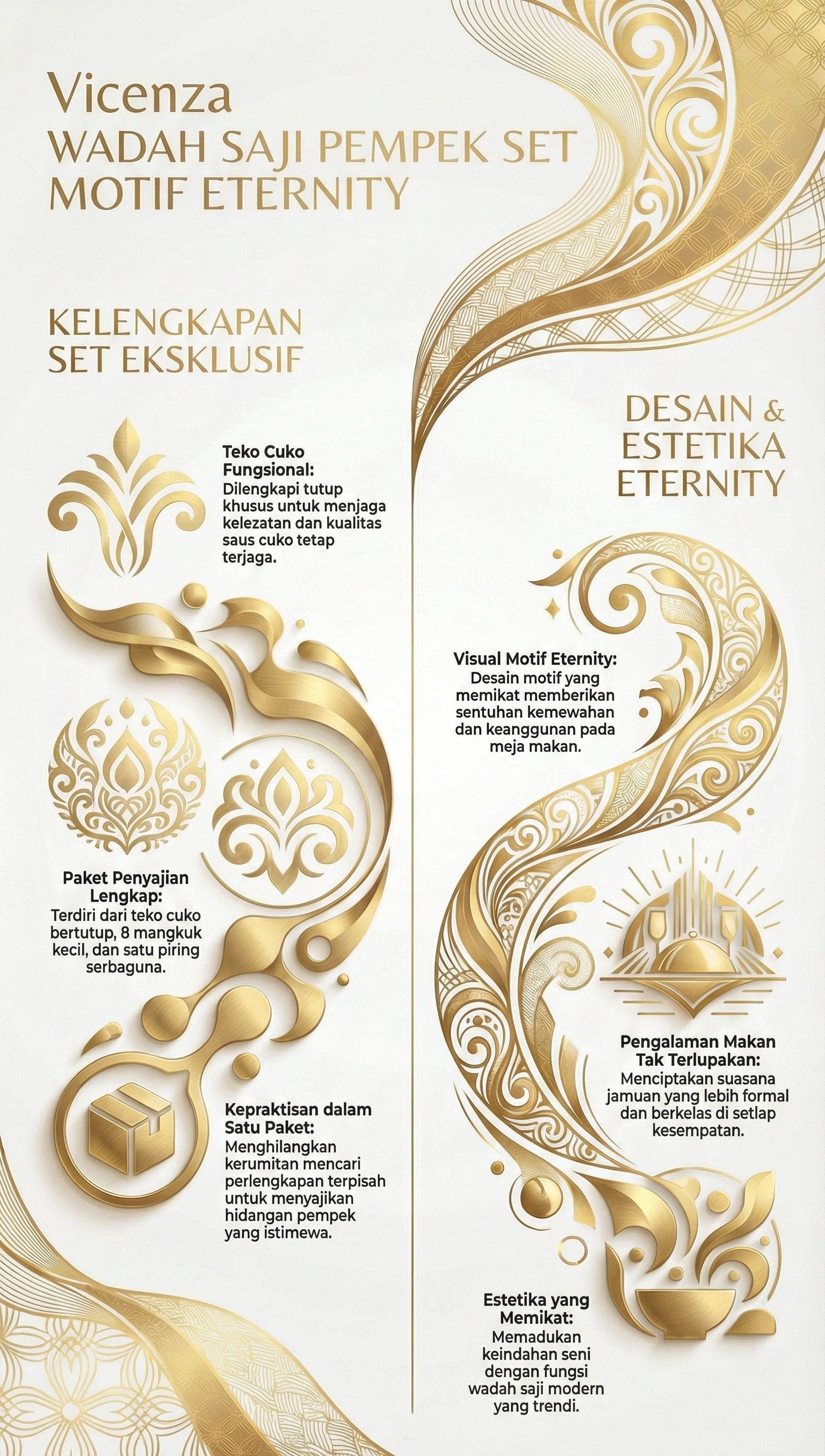 Motif Eternity memberikan sentuhan elegan ke meja makan Anda, menciptakan pengalaman bersantap yang tak terlupakan. Dengan tambahan 1 piring yang serbaguna, setiap hidangan Pempek menjadi lebih sempurna.