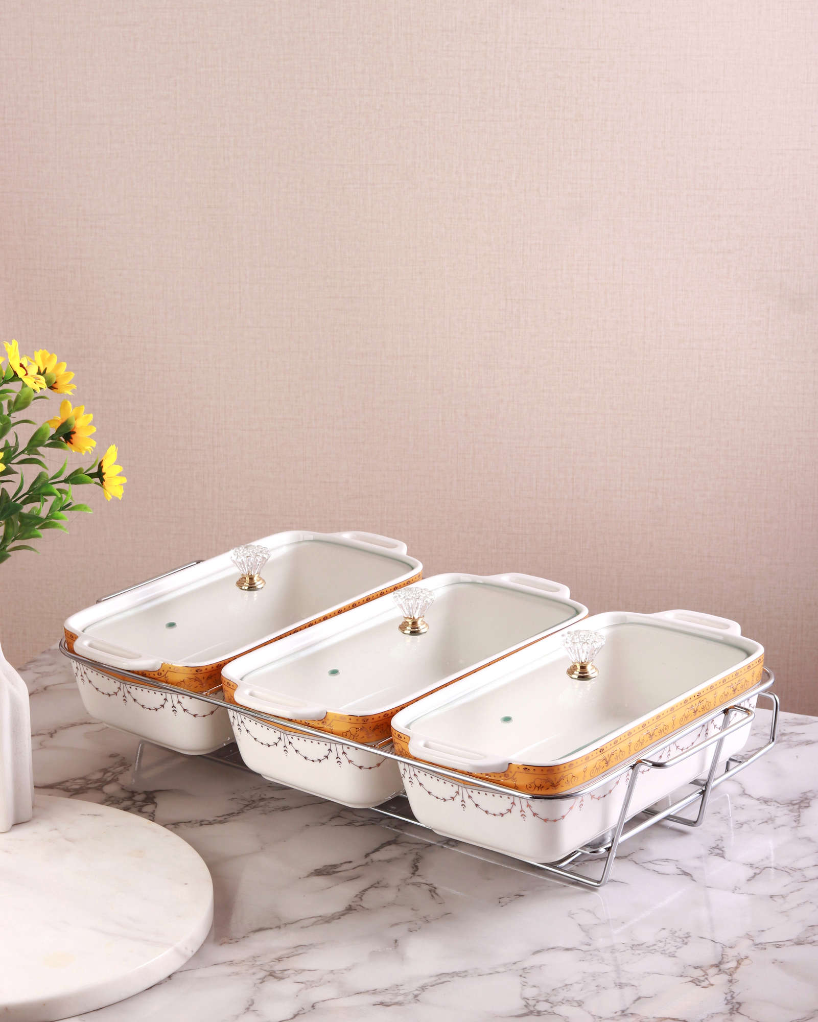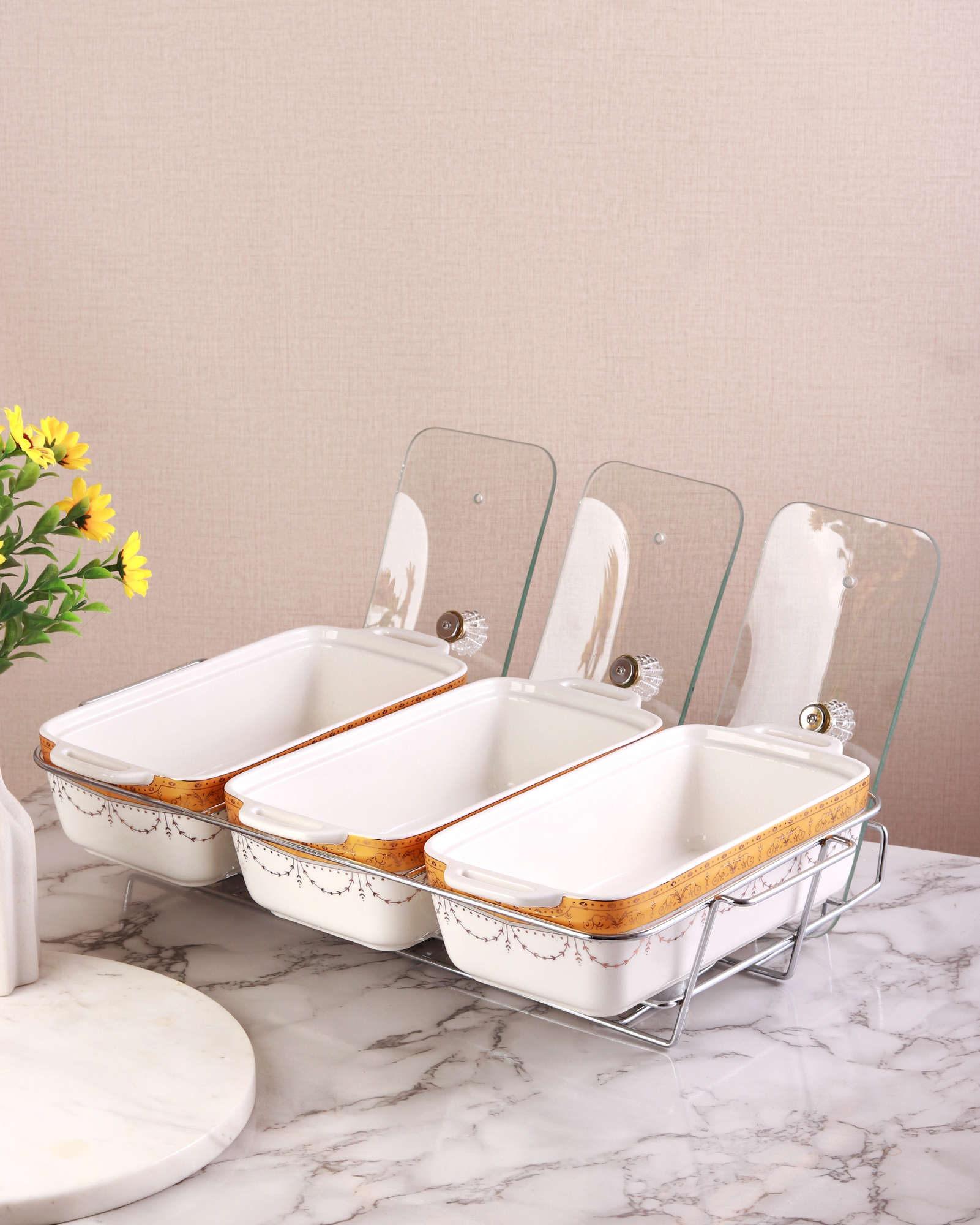Hadir dengan motif Padi yang elegan, set wadah saji ini memadukan desain ergonomis dan fungsionalitas tinggi. Terdiri dari 3 buah wadah saji porselen berkapasitas 1.3 L, rak multifungsi, penutup kaca, dan lilin penghangat yang menjaga kualitas hidangan tetap prima. Solusi lengkap dan praktis untuk berbagai jenis hidangan. Miliki koleksinya sekarang juga di toko resmi Vicenza!