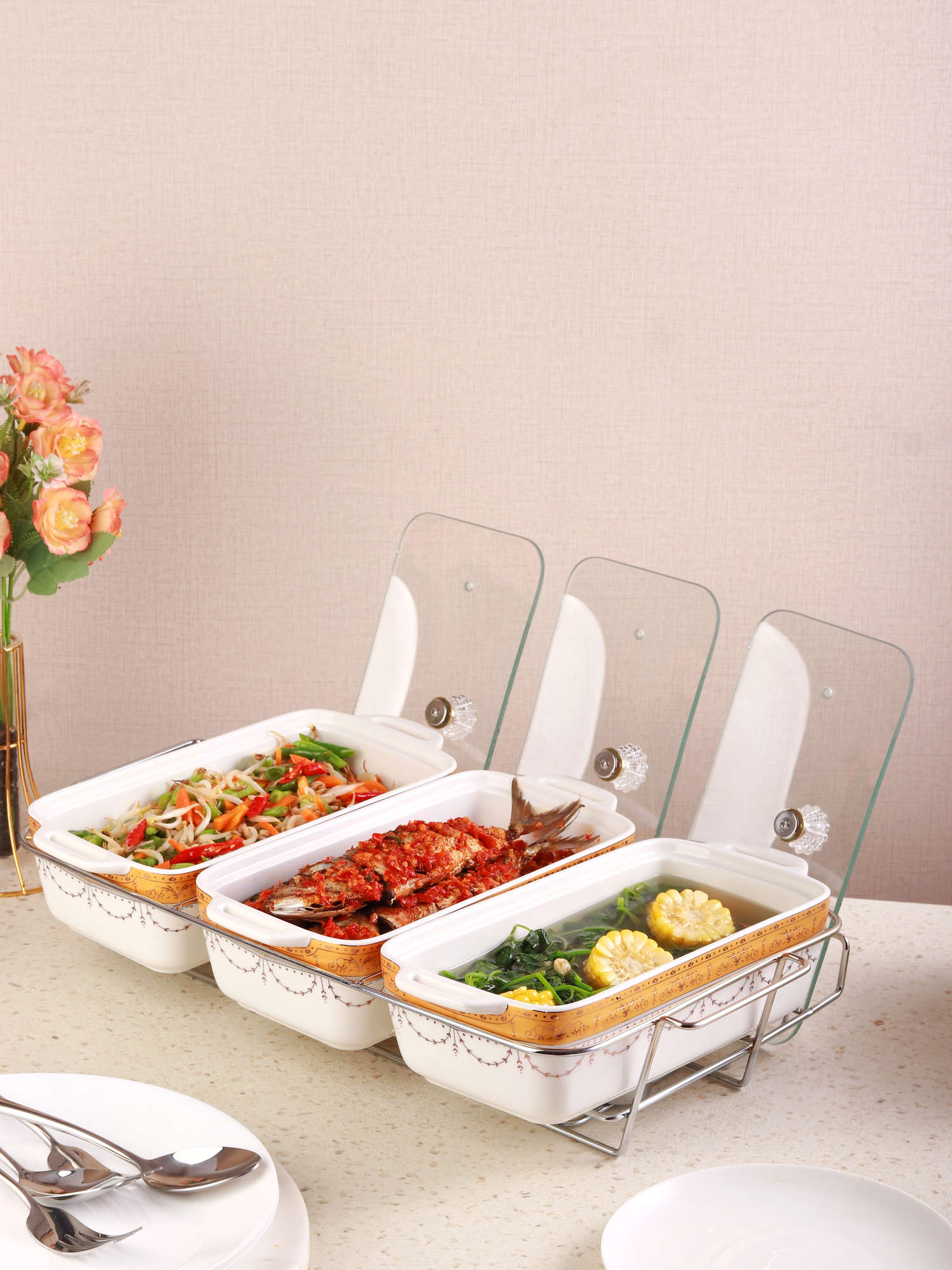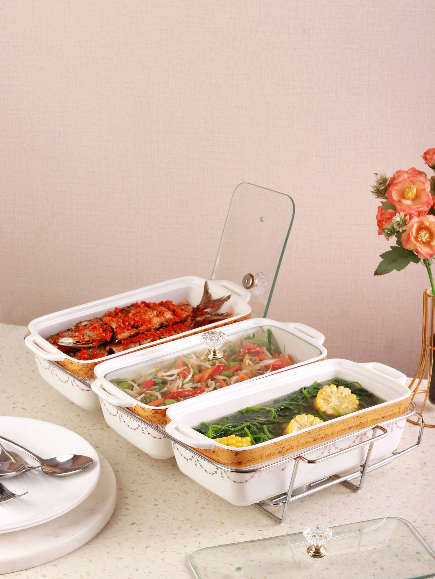 Wadah saji terbuat dari bahan Porcelain berkapasitas besar (1.3L per wadah) sehingga cukup untuk menampung makanan dalam jumlah banyak.