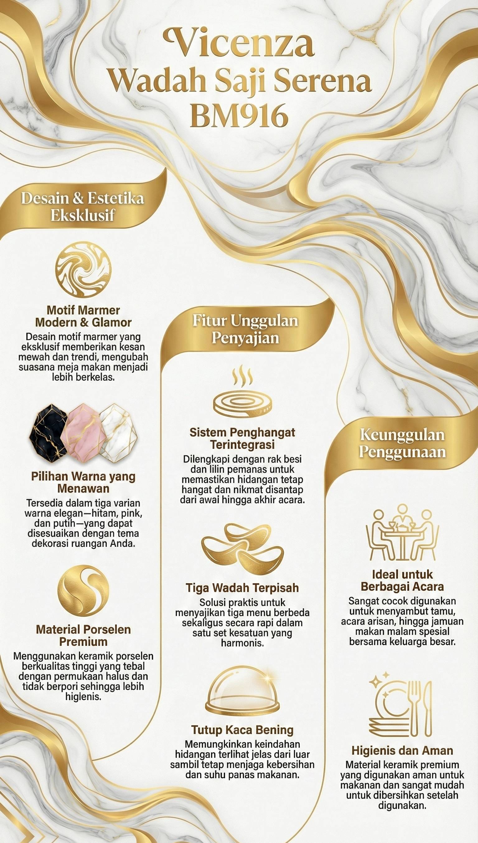 Sajikan tiga jenis menu berbeda dalam satu wadah dengan Wadah Saji Serena Motif Marmer Warna Putih (BM916) dari Vicenza! Produk ini dapat menjadi solusi untuk menyajikan hidangan yang berbeda dalam satu waktu dan dinikmati bersama keluarga maupun orang tercinta.