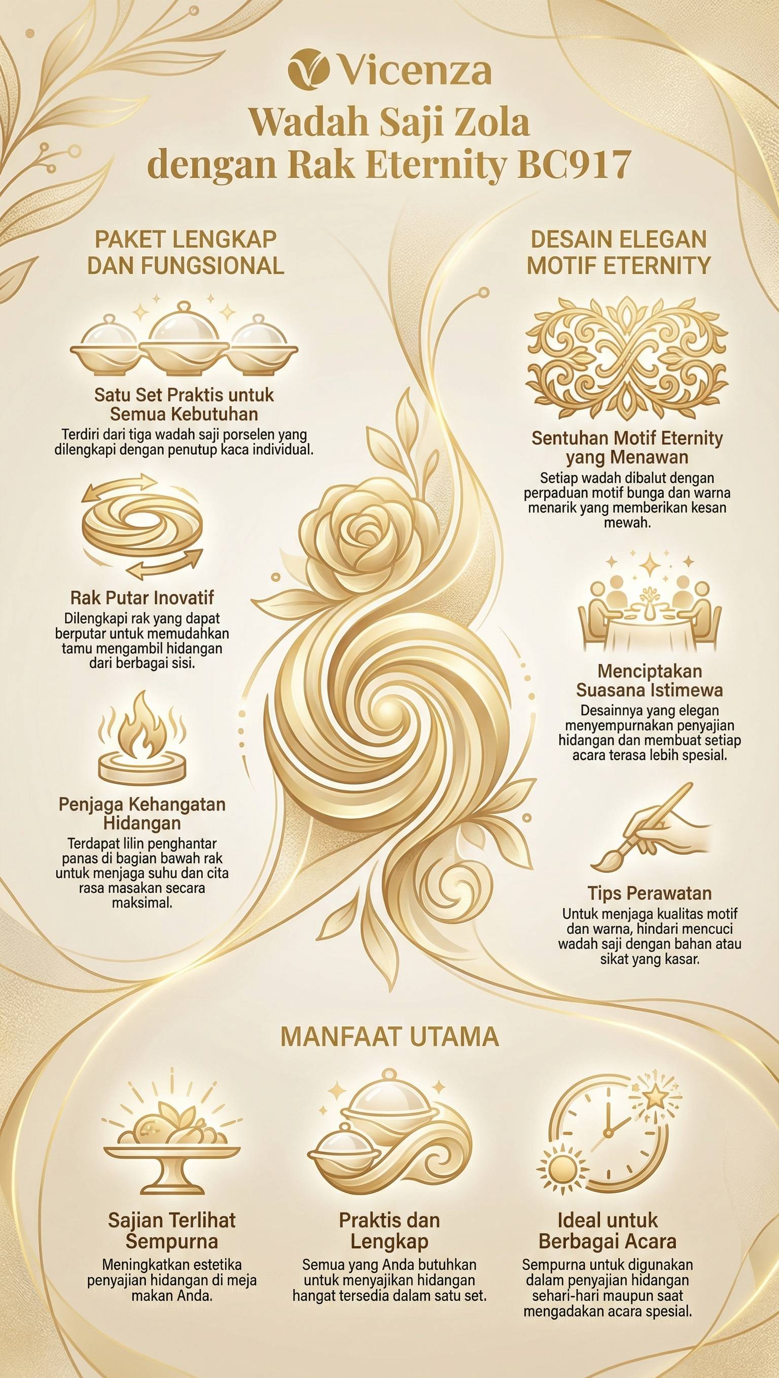 Setiap wadah dalam set wadah saji ini dibalut dengan motif eternity yang menawan. Saat digunakan meninggalkan kesan yang elegan dengan perpaduan bunga dan warna yang menarik. Untuk menjaga kualitas motif dan warna, hindari mencuci prasmanan dengan bahan yang kasar.