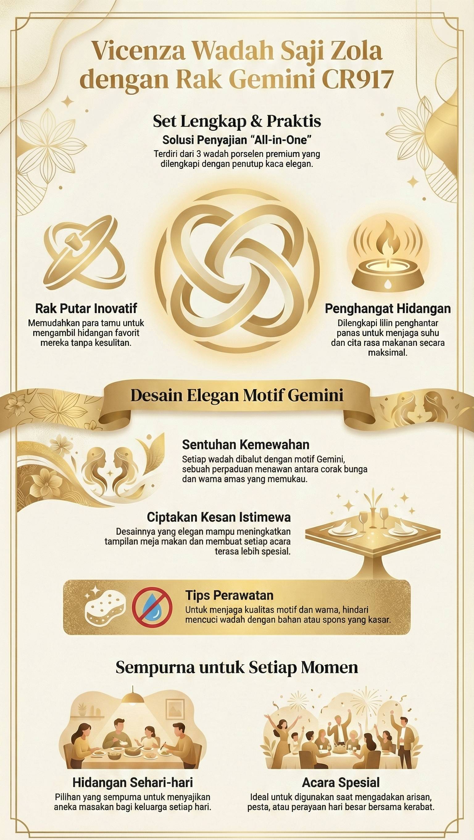 Sajian hidangan terlihat semakin sempurna dengan Wadah Saji Zola CR917 dari Vicenza! Casserole ini terdiri dari 3 buah wadah berbahan porselen lengkap dengan penutup kaca. Selain itu, dilengkapi juga dengan rak putar untuk memudahkan saat mengambil sajian dengan lilin penghantar panas untuk menjaga cita rasa dengan maksimal. Semua lengkap dan praktis dalam satu set! Sempurna sebagai pilihan dalam menyajikan hidangan sehari-hari maupun saat mengadakan acara spesial sehingga terasa lebih istimewa.