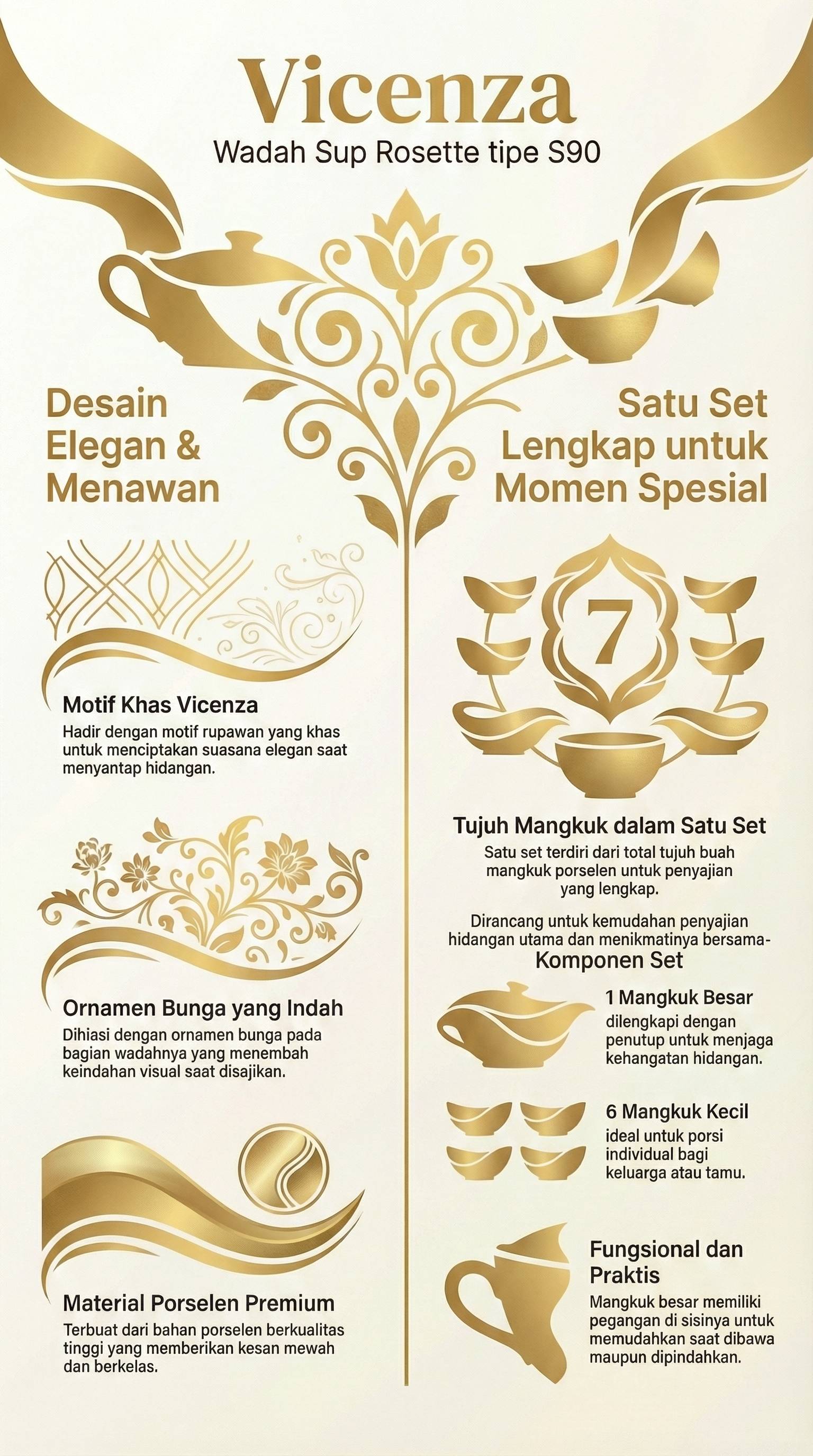 Wadah sup ini terbuat dari porselen yang terdiri dari satu mangkuk besar dengan penutup untuk menyajikan hidangan utama. Pada bagian sisinya terdapat pegangan yang memudahkan saat dibawa maupun dipindahkan. Terdiri juga dari enam mangkuk kecil untuk menyantap hidangan yang telah disajikan. Nikmatilah hidangan Anda bersama keluarga maupun tamu dengan kehadiran Vicenza Wadah Sup Rosette – Lily S90!