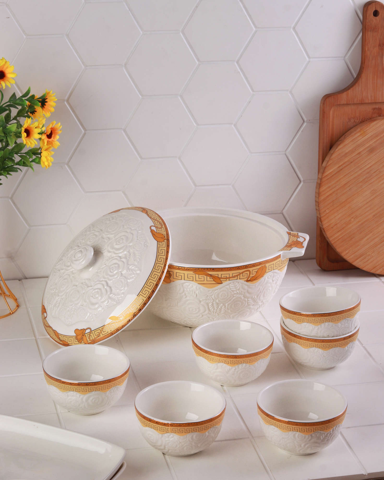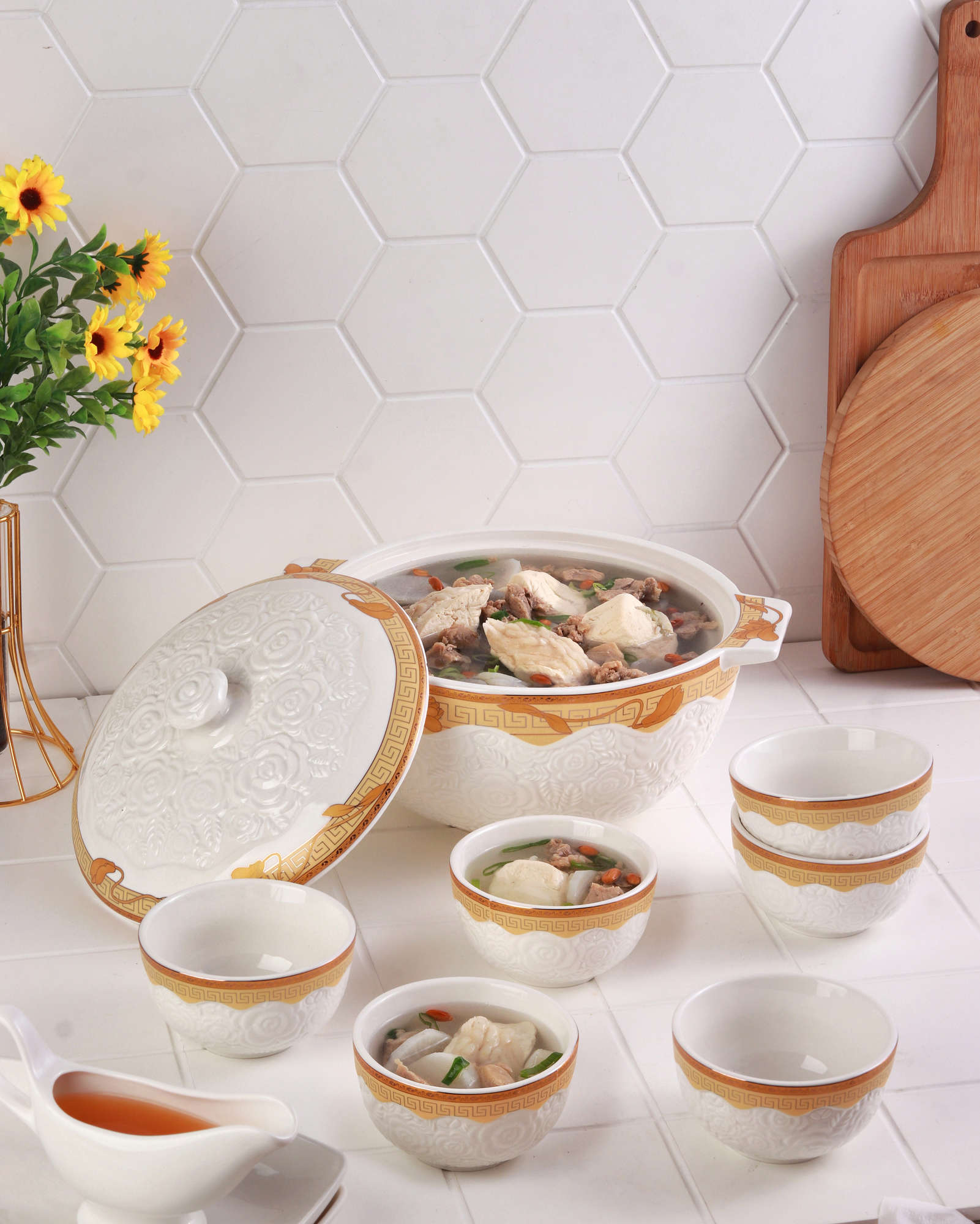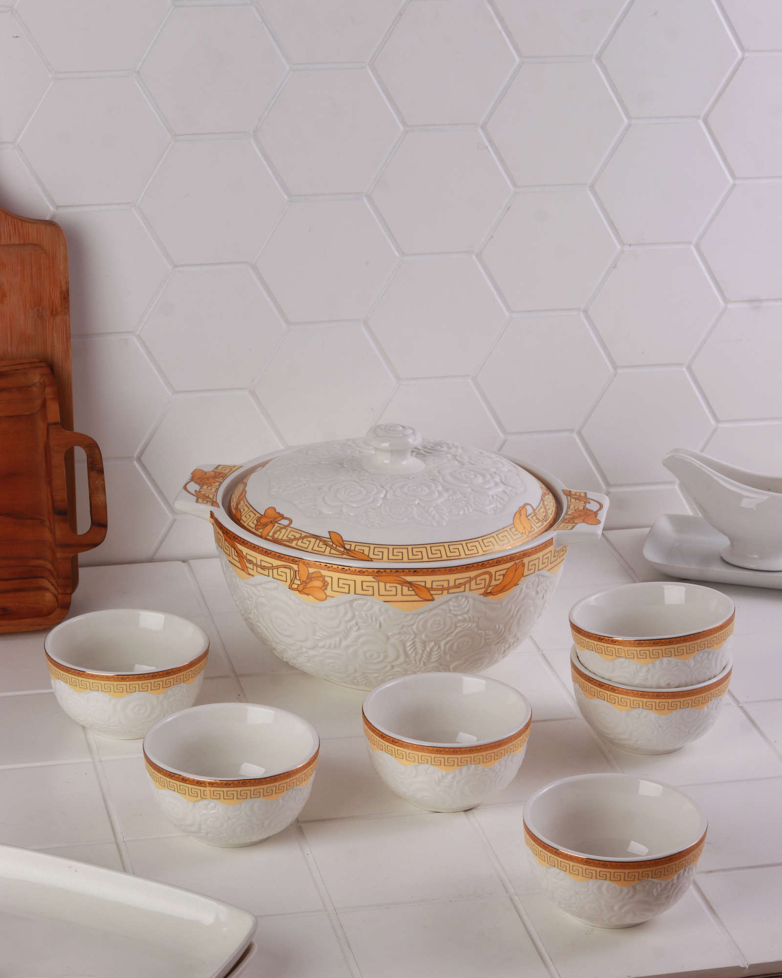 Wadah sup ini terbuat dari porselen yang terdiri dari satu mangkuk besar dengan penutup untuk menyajikan hidangan utama. Pada bagian sisinya terdapat pegangan yang memudahkan saat dibawa maupun dipindahkan. Terdiri juga dari enam mangkuk kecil untuk menyantap hidangan yang telah disajikan. Nikmatilah hidangan Anda bersama keluarga maupun tamu dengan kehadiran Vicenza Wadah Sup Rosette – Lily S90!