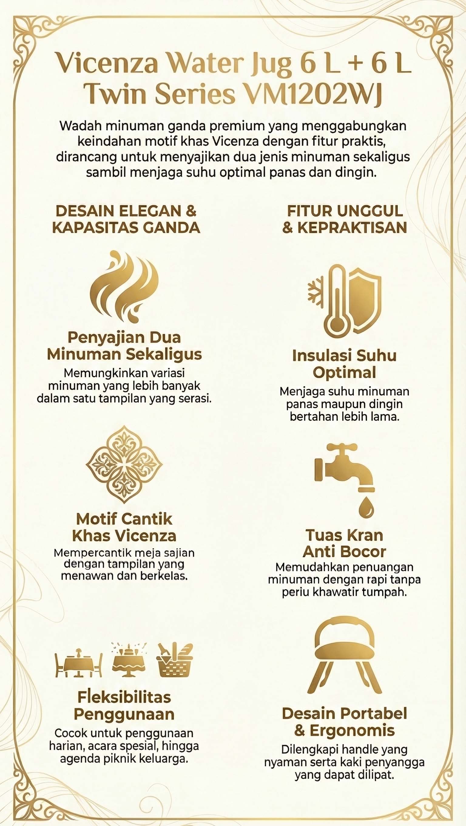 Bisa digunakan untuk kebutuhan sehari-hari, saat mengadakan acara spesial, maupun dibawa dalam agenda piknik dan berlibur bersama orang tercinta. Segera miliki dan nikmati kemudahan juga keindahan dalam menyajikan minuman dengan water jug Vicenza!