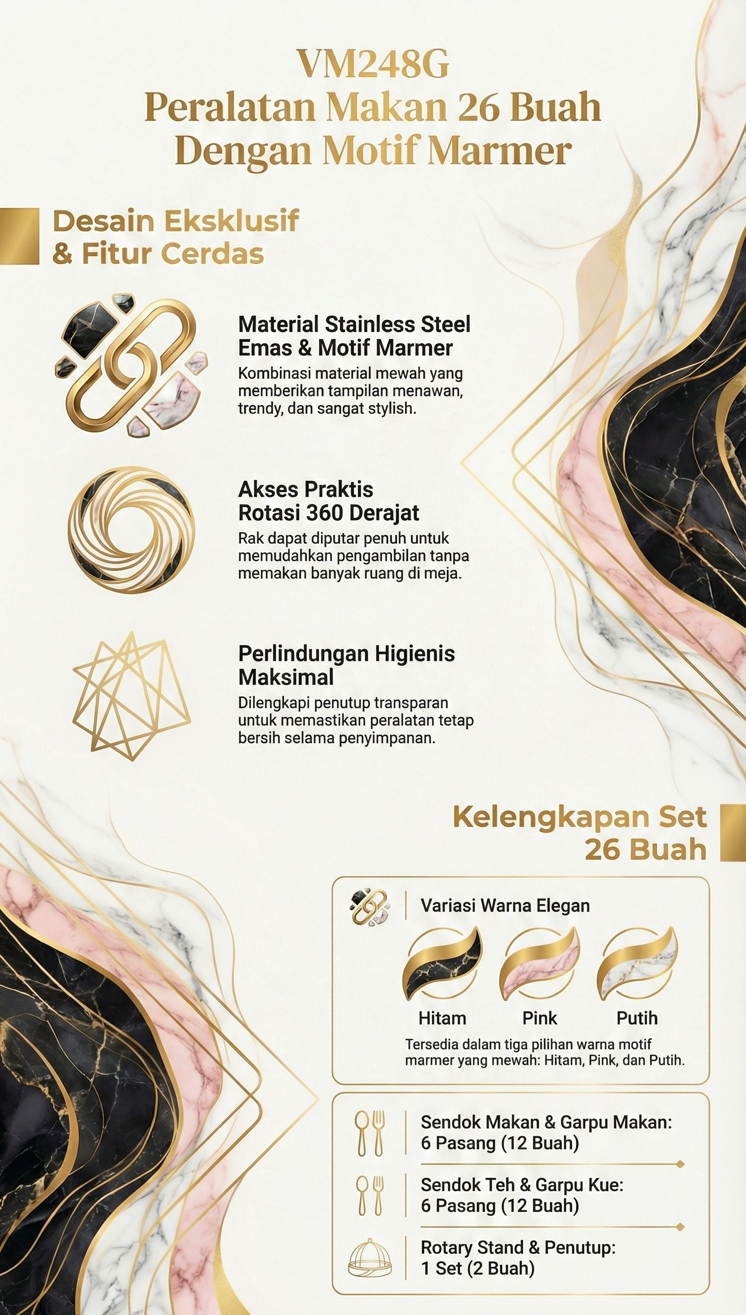 Setiap peralatan makan dalam produk ini terbuat dari stainless steel, berwarna emas, dan dilapisi motif marmer pada pegangannya. Terlihat stylish dan menawan. Untuk memudahkan pengambilan, produk ini juga dapat diputar 360 derajat dan tentunya tidak memakan banyak tempat saat diletakkan di meja maupun lemari.