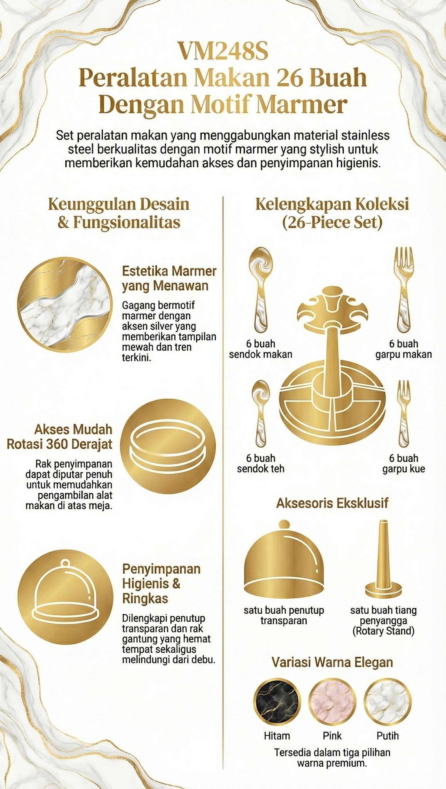 Setiap peralatan makan dalam produk ini terbuat dari stainless steel, berwarna silver, dan dilapisi motif marmer pada pegangannya. Terlihat stylish dan menawan. Untuk memudahkan pengambilan, produk ini juga dapat diputar 360 derajat dan tentunya tidak memakan banyak tempat saat diletakkan di meja maupun lemari.