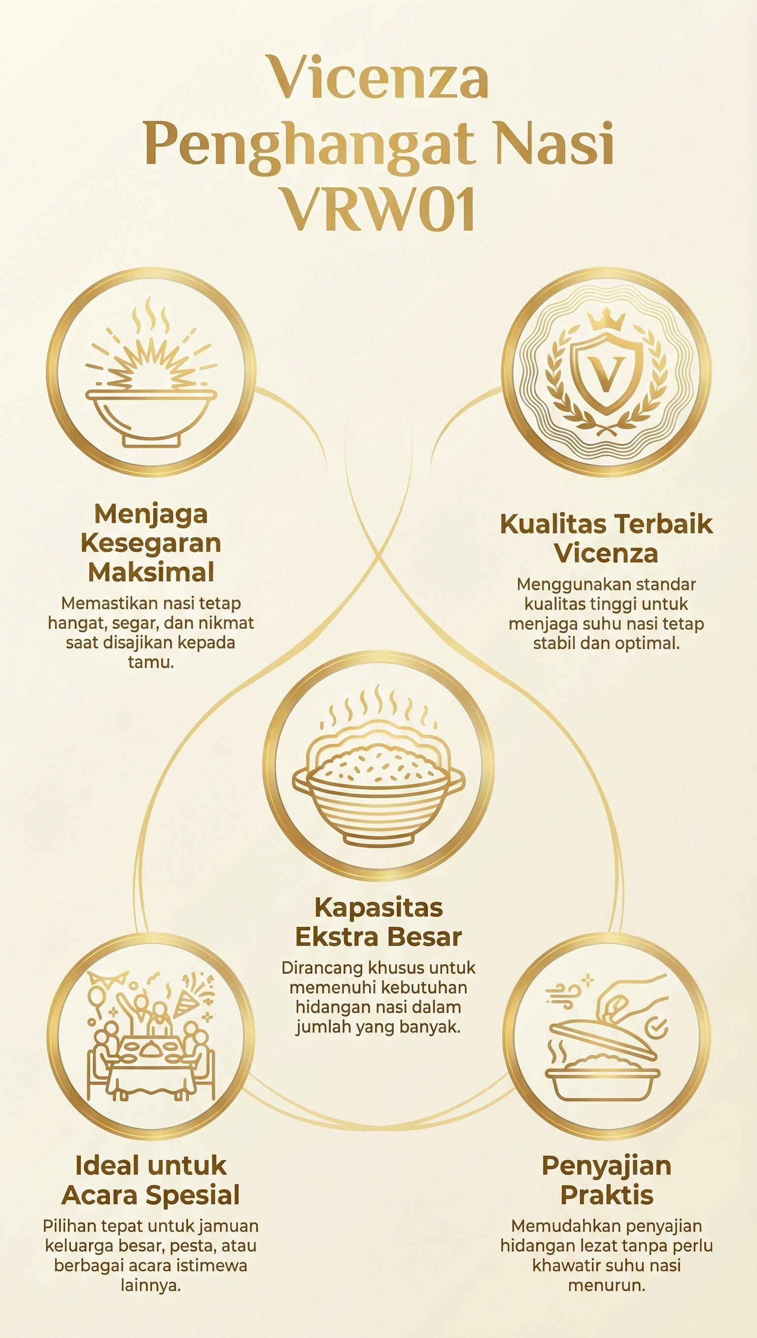 Dapatkan kualitas terbaik untuk menjaga nasi tetap hangat dengan Penghangat Nasi tipe VRW01 dari merek Vicenza! Dengan kapasitas besar 20 liter, produk ini akan menjaga nasi Anda tetap segar dan panas untuk keluarga besar atau acara istimewa. Tidak perlu khawatir tentang suhu nasi saat makanan disajikan. Penghangat Nasi VRW01 dari Vicenza adalah solusi ideal untuk menyajikan hidangan nasi yang lezat dalam jumlah besar.