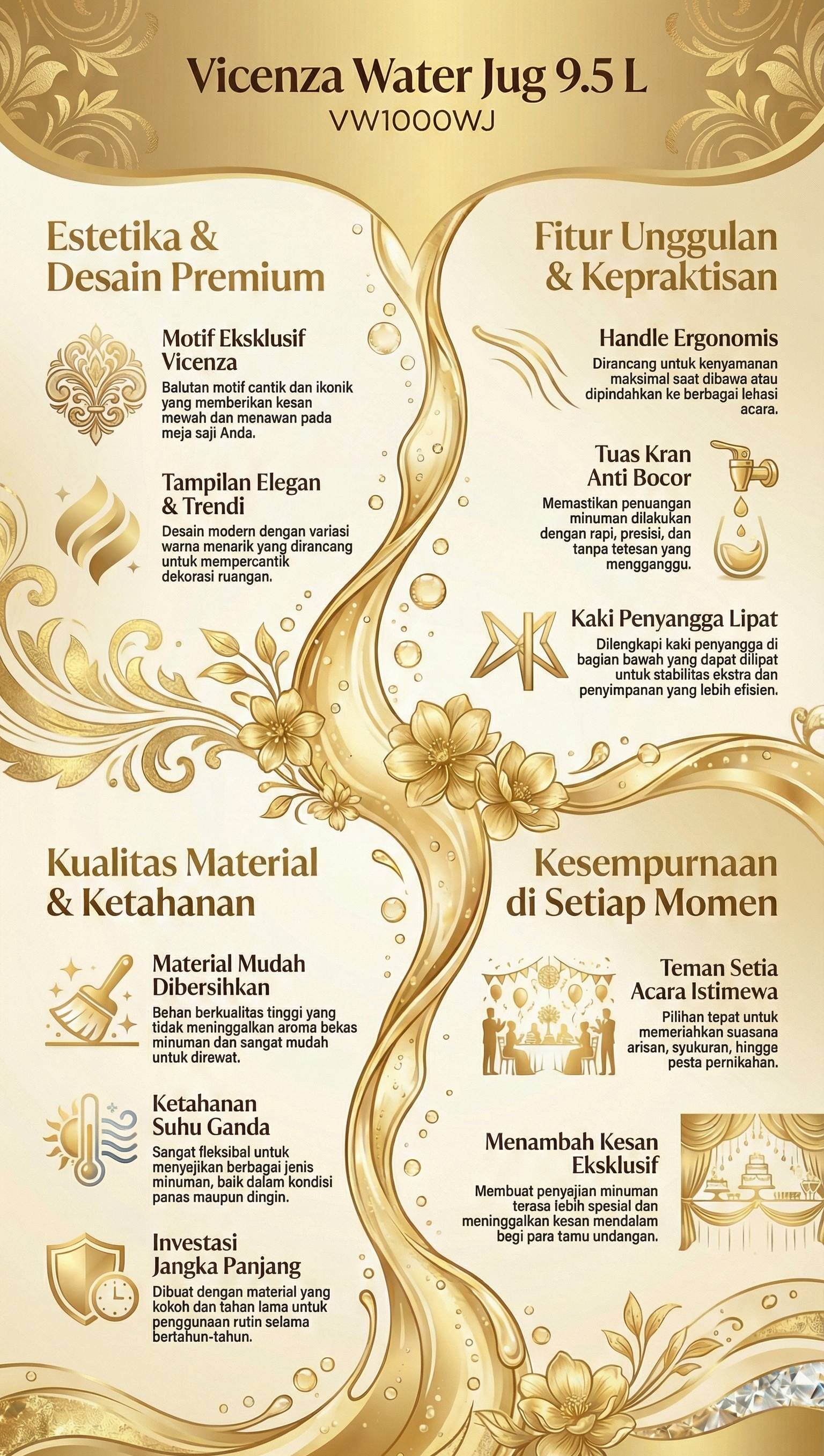 Penggunaannya sangat cocok untuk menyajikan minuman dalam acara seperti arisan, syukuran, maupun acara spesial lain sehingga terasa lebih istimewa. Segera miliki dan nikmati kemudahan juga keindahan dalam menyajikan minuman dengan water jug Vicenza!