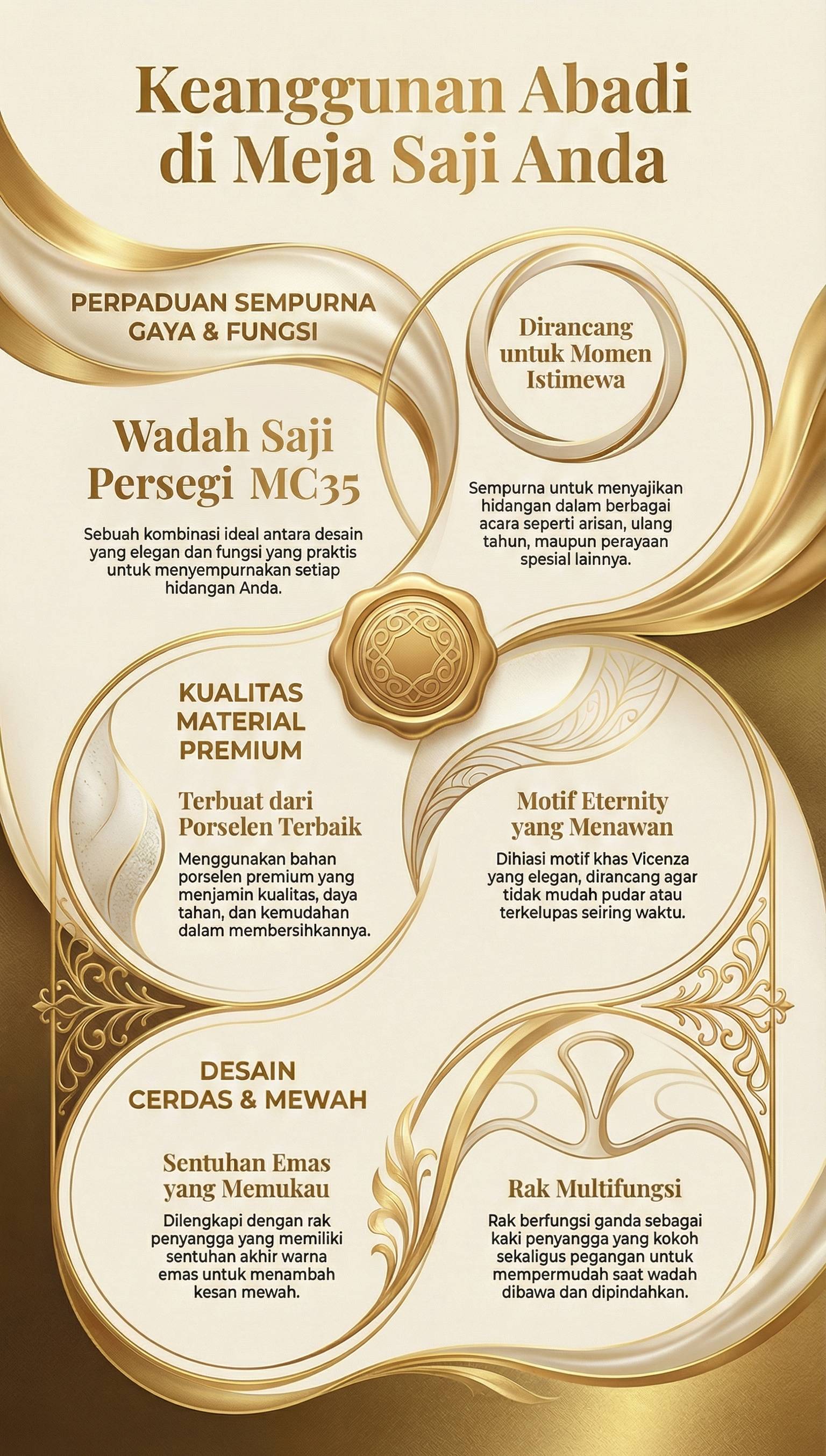 Sajikan hidangan dengan Wadah Saji Persegi Klasik (classic square casserole) MC35 dari Vicenza! Terbuat dari bahan porselen premium dengan balutan motif Eternity yang menawan. Set wadah saji ini memadukan desain yang elegan dan fungsi praktis. Dilengkapi penutup beserta rak dengan sentuhan warna emas yang memukau. Cocok digunakan untuk menyajikan hidangan dalam berbagai acara seperti arisan, ulang tahun, maupun perayaan istimewa lainnya. Setiap hidangan tersaji dengan lebih sempurna bersama Vicenza!