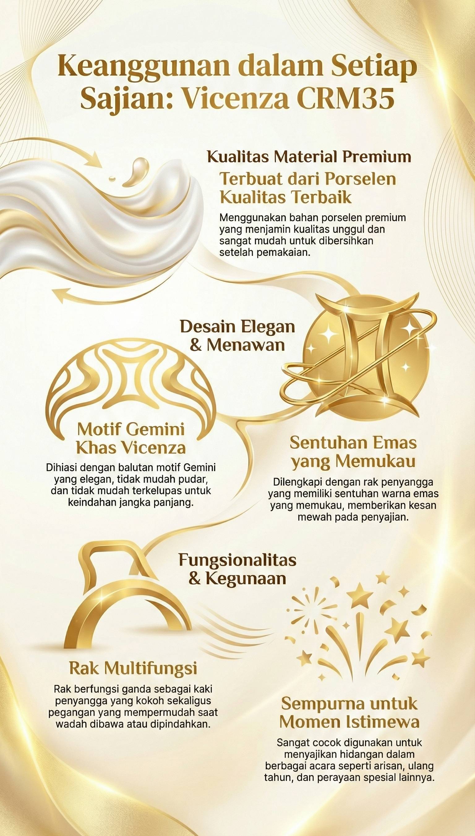 Sajikan hidangan dengan Wadah Saji Persegi Klasik (classic square casserole) CRM35 dari Vicenza! Terbuat dari bahan porselen premium dengan balutan motif Gemini yang menawan. Dilengkapi penutup beserta rak dengan sentuhan warna emas yang memukau. Cocok digunakan untuk menyajikan hidangan dalam berbagai acara seperti arisan, ulang tahun, maupun perayaan istimewa lainnya. Setiap hidangan tersaji dengan lebih sempurna bersama Vicenza!
