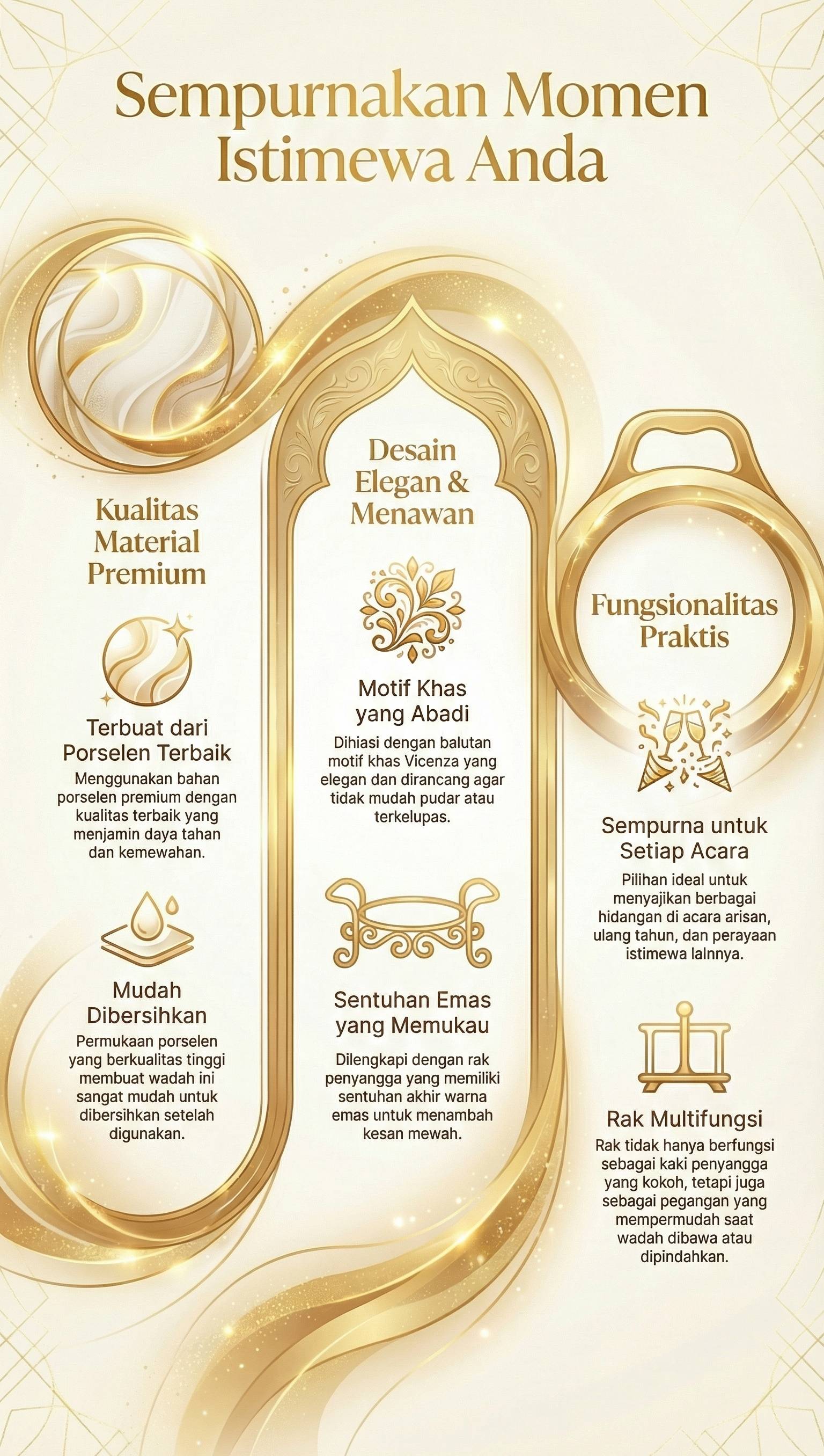 Sajikan hidangan dengan Wadah Saji Persegi Klasik (classic square casserole) M35 dari Vicenza! Terbuat dari bahan porselen premium dengan balutan motif Padi yang menawan. Dilengkapi penutup beserta rak dengan sentuhan warna emas yang memukau. Cocok digunakan untuk menyajikan hidangan dalam berbagai acara seperti arisan, ulang tahun, maupun perayaan istimewa lainnya. Setiap hidangan tersaji dengan lebih sempurna bersama Vicenza!